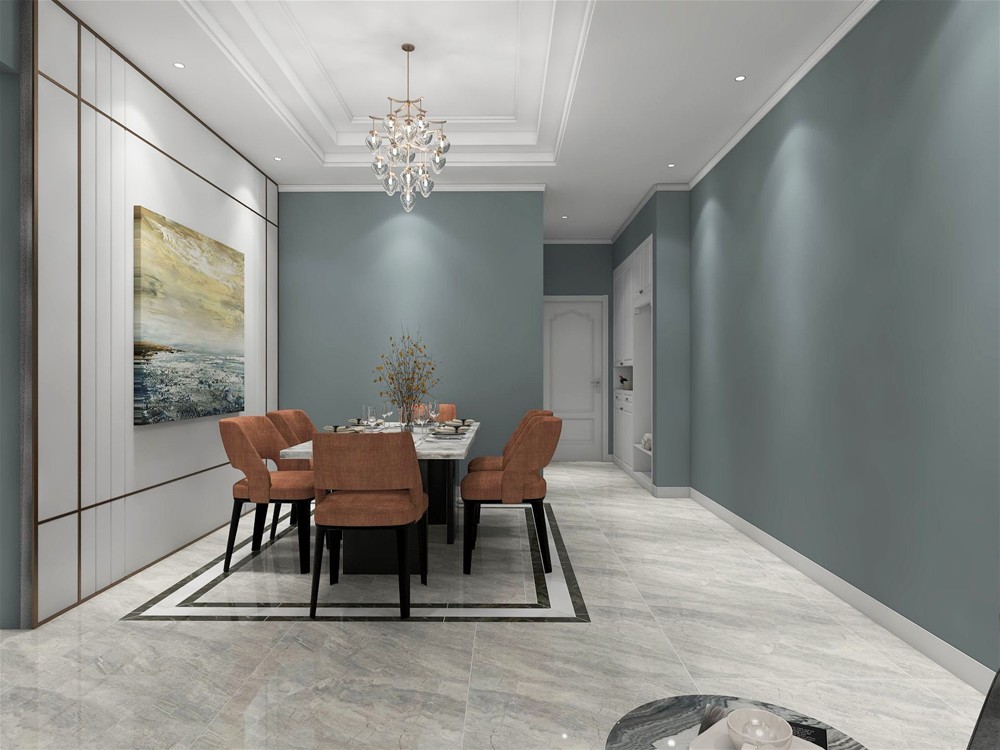 開放式的餐廳與客廳相連通,中間的走廊讓客廳、餐廳區域分明,餐廳矩形餐桌和復古的吊燈組合,天花是簡單的雕花,留住了中式韻味注入了新中式的創新元素。