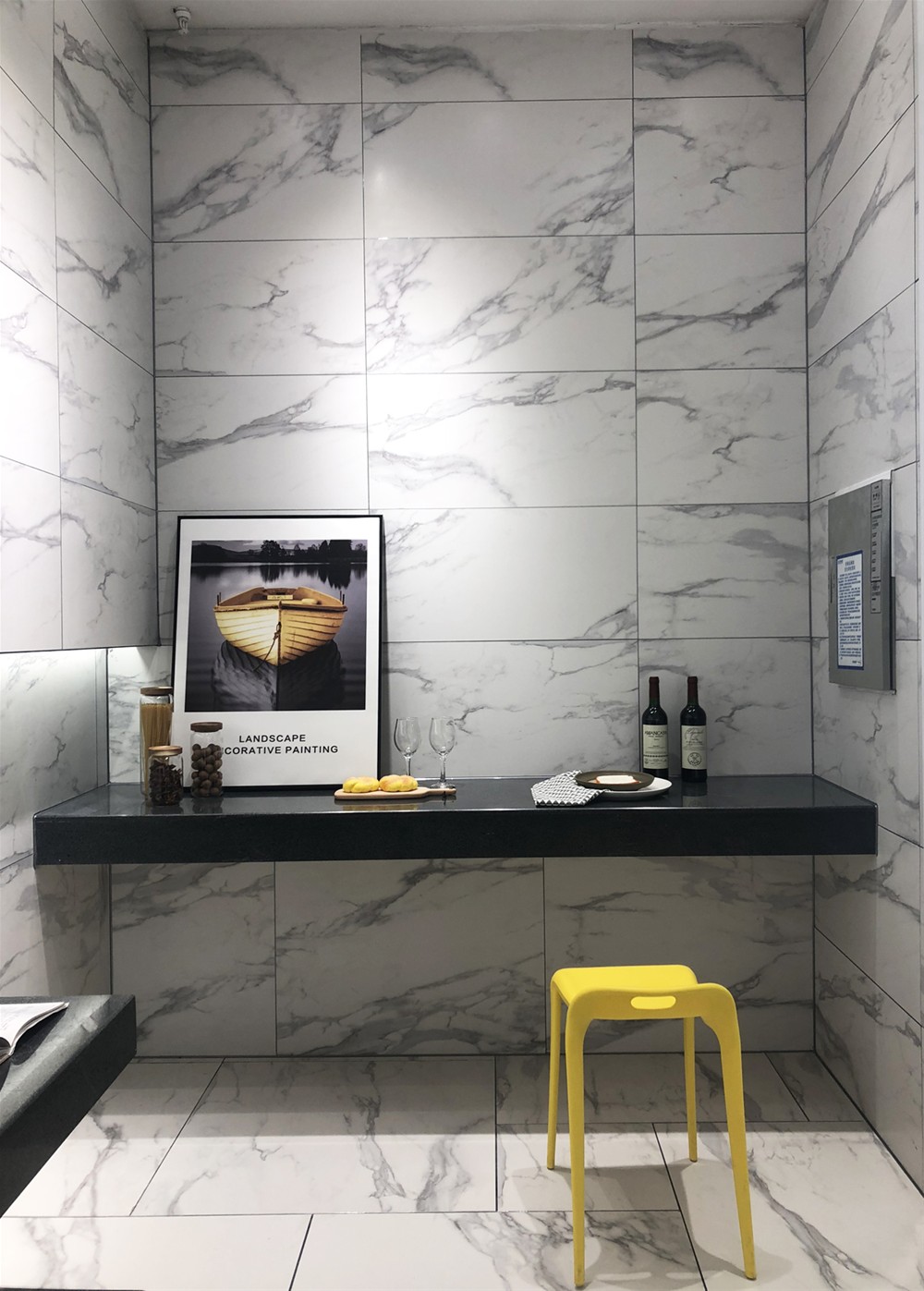 墻磚可作電視背景墻、廚衛墻面磚、陽臺墻面磚使用。整塊白色墻面優雅加之隨意的灰色紋理個性灑脫,是金艾陶的暢銷產品之一。