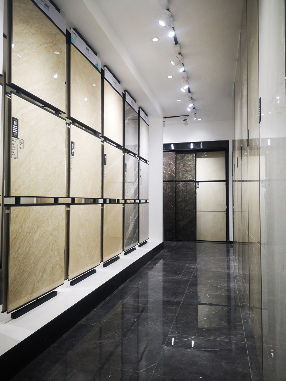 這是選材區,打豎的陳列方式射燈下的產品,直觀、整潔、大氣、很好地凸顯產品的紋理,推拉陳列方式主要針對噴墨瓷片,簡單一堵墻就能把噴墨瓷片的搭配、鋪貼、風格直觀呈現。