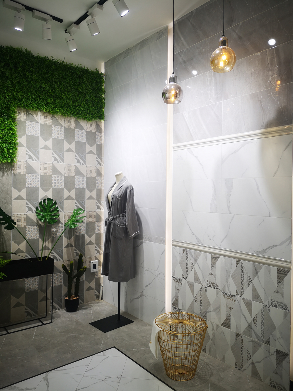 這是由新品通體大理石KTA9818、KTA9819鋪貼的墻面,沒有更多造型,簡單的瓷磚切割鋪貼,優雅大氣的空間氛圍呈現眼前。