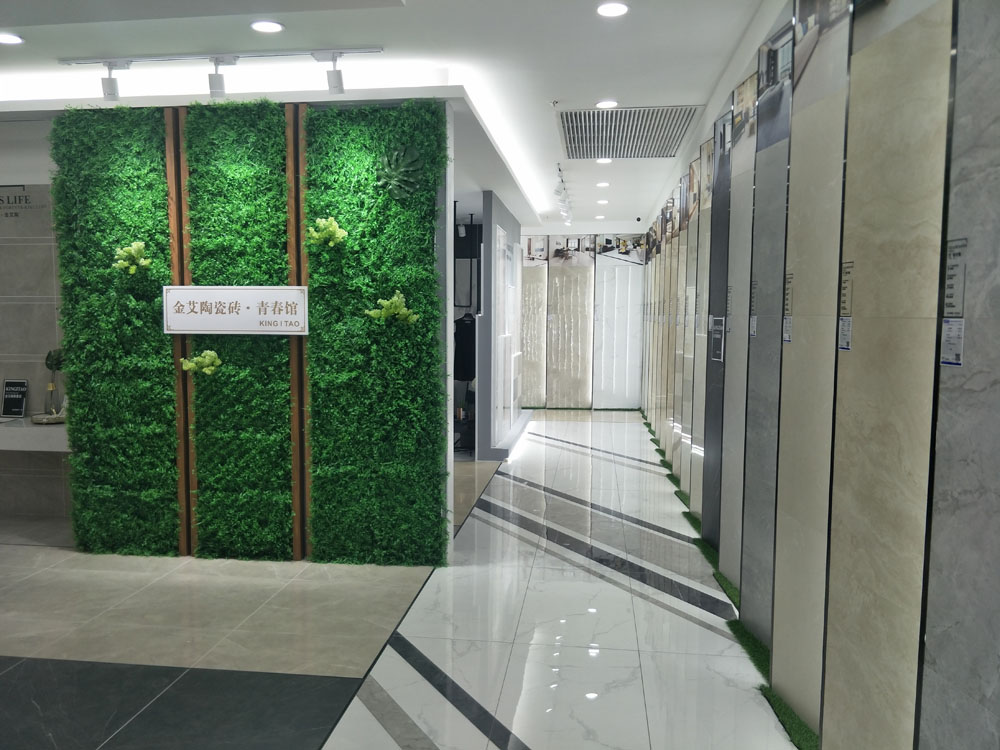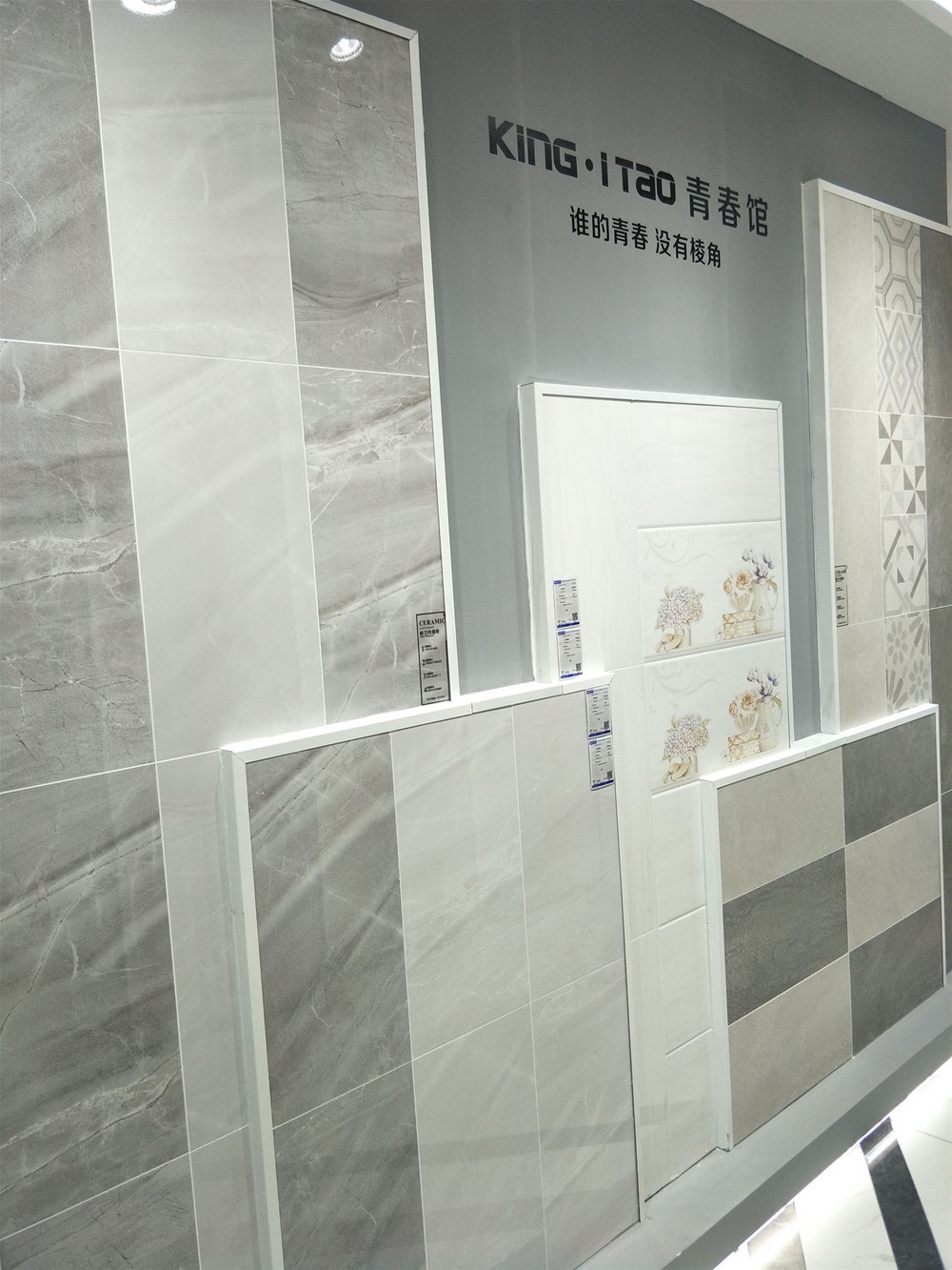 這是我們配套噴墨瓷片的展示墻,花片、小地磚、腰線、瓷片一應俱全,廚房、衛生間、陽臺等空間都適用,讓你完全省掉了搭配的麻煩。