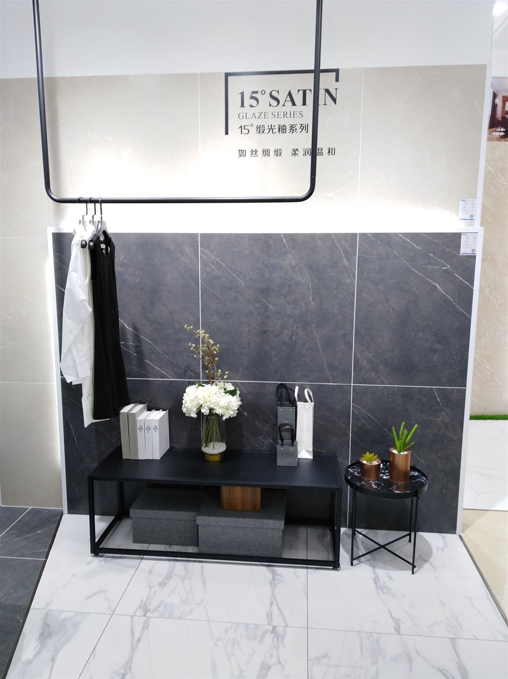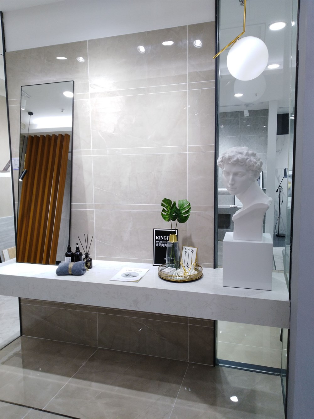 從外立面的櫥窗就能看到我們其中一個模擬間設計,這是由九面通體大理石KB9M61208卡門深灰單獨鋪貼,深灰色瓷磚搭配金色軟裝營造出神秘、沉穩、輕奢的空間氛圍,這款瓷磚鋪貼客廳地面,電視背景墻等地方同樣適合。