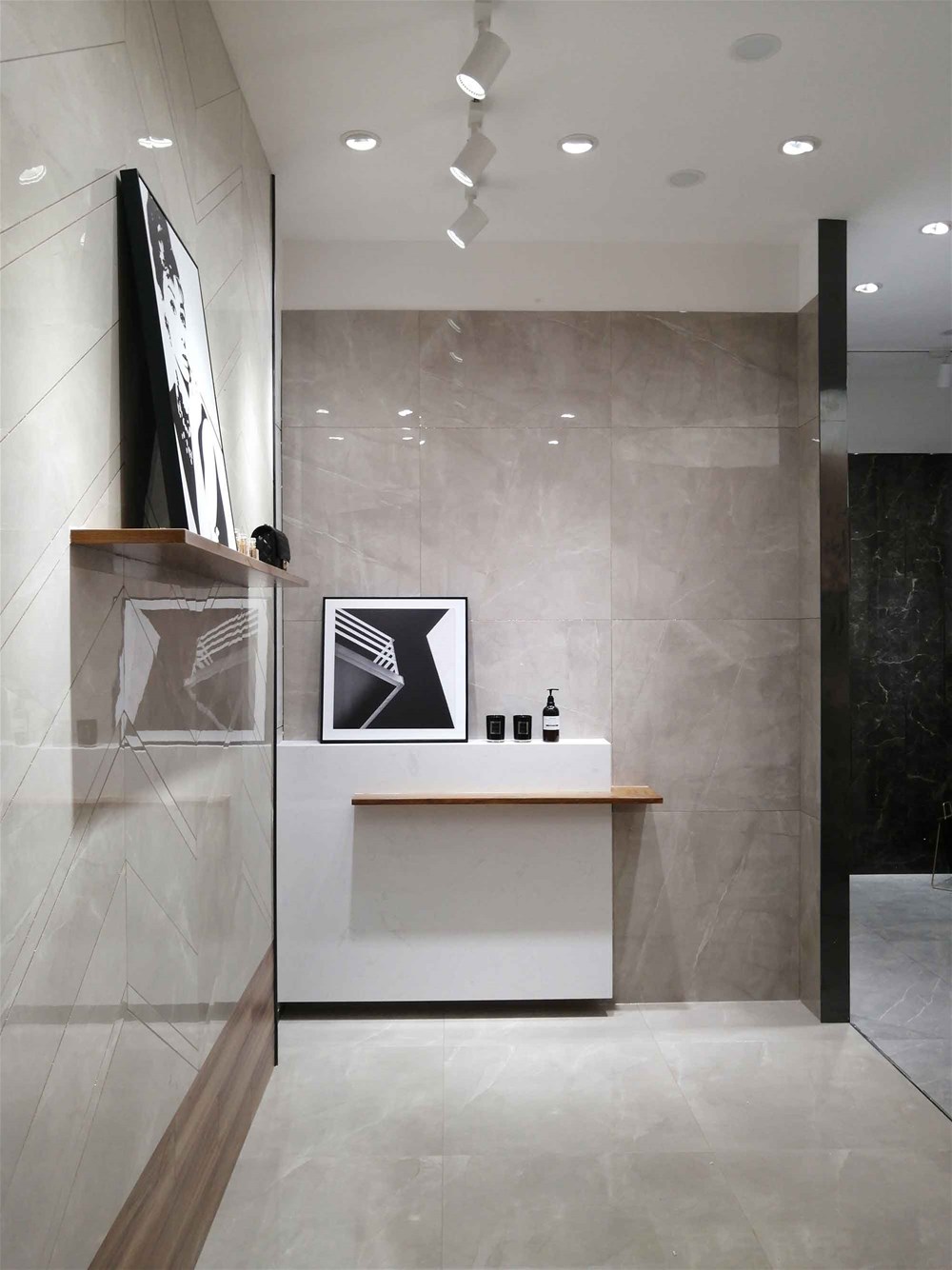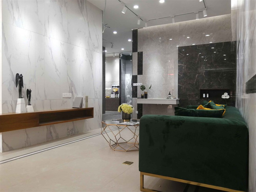 這是我們的前臺,logo背景墻選用九面通體大理石KA9M61209直鋪,灰色大紋理營造出簡約、優(yōu)雅、大氣的空間氛圍,家里客廳電視背景墻、地面同樣適用。這是近兩年家居裝修非常流行的顏色,不知道您喜不喜歡呢?