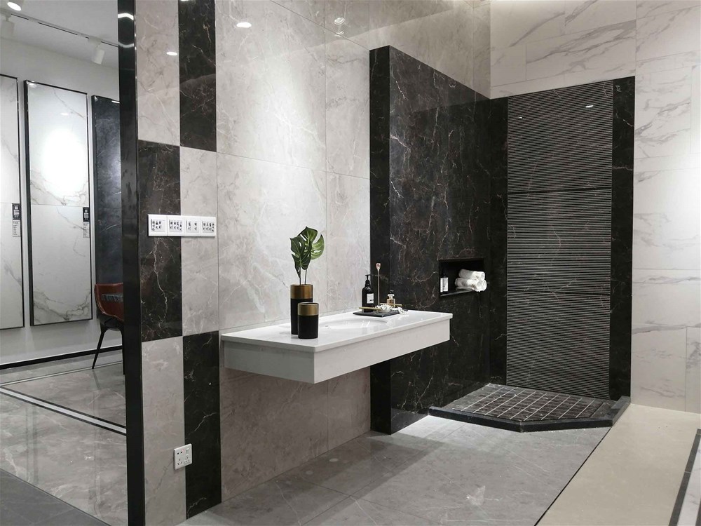 這是由通體大理石KTB9818達曼深咖和KA9M61209尼泊爾灰搭配鋪貼的衛(wèi)生間,衛(wèi)生間是比較私密的空間,選用深色磚隔開淋浴區(qū)域,最適合不過,磚面紋理自然逼真不會顯得太過深沉,很多高級酒店設(shè)計都是這樣的,這兩款磚同樣適用于地面鋪貼。
