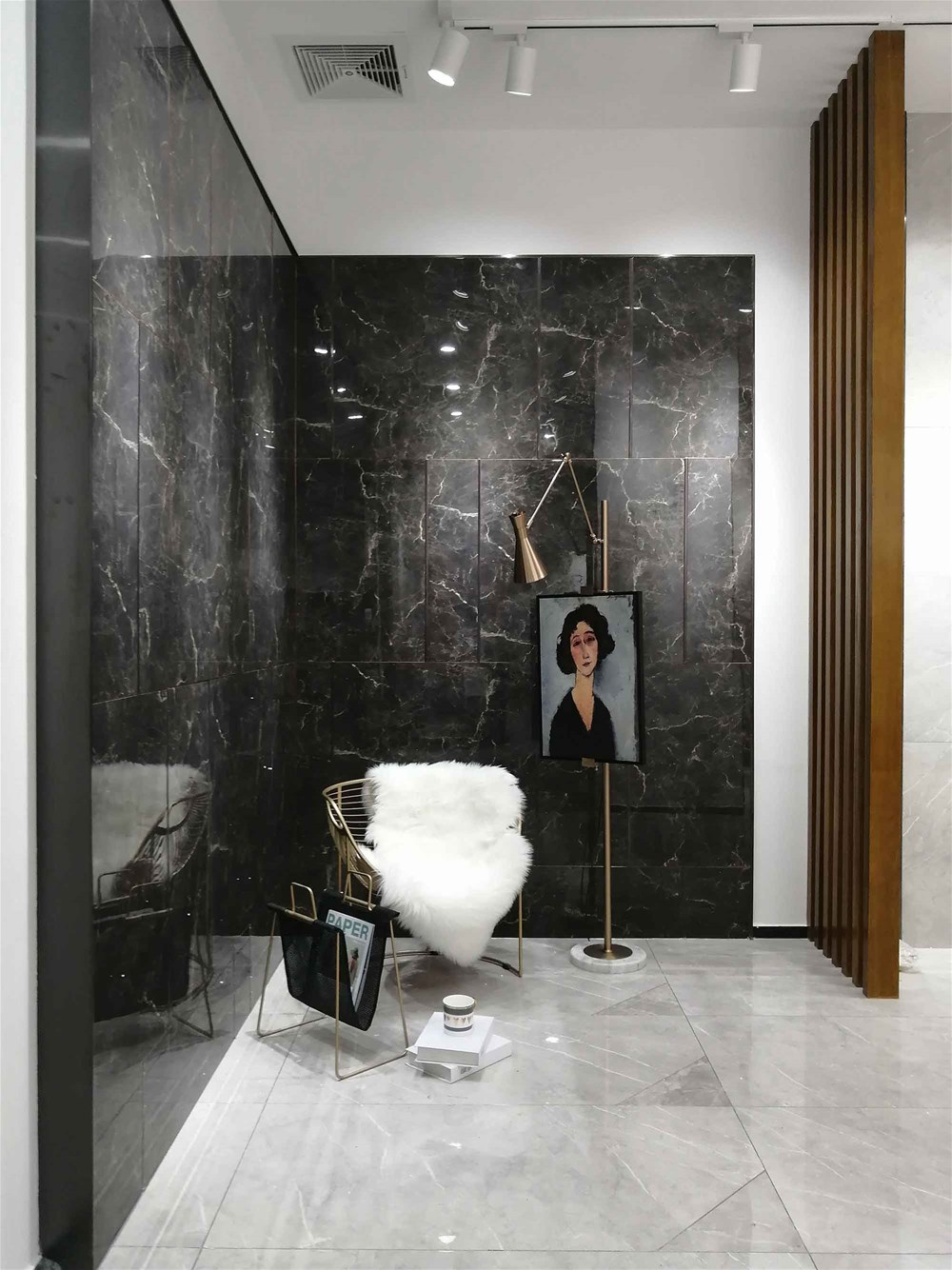 這是由通體大理石KTB9818達曼深咖鋪貼的輕奢陽臺或咖啡廳墻面,地面則由九面通體大理石KA9M61207切割鋪貼,設(shè)計師巧妙運用600*1200規(guī)格產(chǎn)品切割一個角又拼合的方式,賦予空間個性獨特的魅力,十分符合年輕人的品味。這兩款磚用于電視背景墻、各空間地面都是可以的。