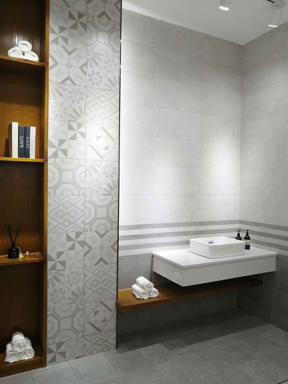 往里邊走,這是我們的選材區(qū),這里集合了200多個瓷磚花式,有通體大理石、15°緞光釉、噴墨瓷片、瓷拋磚、艾釉石、仿古磚等,噴墨瓷片都是配套產(chǎn)品,這邊拉開來就能直觀看到它的鋪貼效果。您再看,地面也是灰色瓷磚鋪貼的效果,您家客餐廳都適合這樣鋪設(shè)的。
