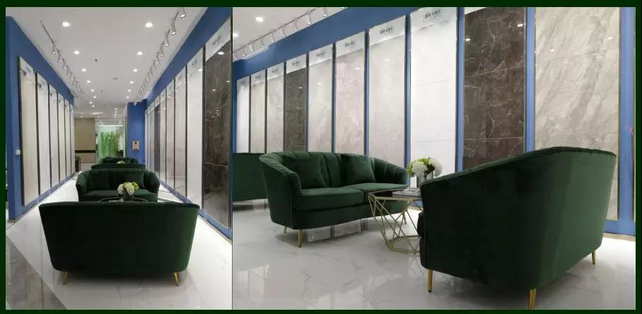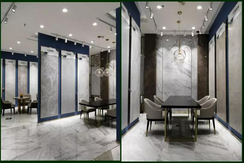 900*1800的大板以屏風(fēng)的形式展現(xiàn),不但很巧妙的體現(xiàn)了大巖板系列產(chǎn)品的紋理和設(shè)計(jì)感,而且通過系列的屏風(fēng)展示很巧妙的把大堂區(qū)域兩邊劃分為接待區(qū)和洽談區(qū),靜/動兩個區(qū)。