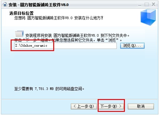 例如:假設要選擇I盤,點擊“瀏覽”,選擇I盤(安裝完畢后會在I盤生成3dshow_ceramic文件夾,軟件的所有文件都保存在這里)