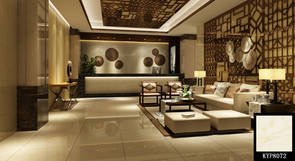此空間采用的陶瓷一線品牌金艾陶玉石瓷磚:冰王玉KYP8072進行裝飾鋪貼。質感通透的磚面,逼真的玉石神采,使得整個空間籠罩在柔和的光澤中,溫潤動人。