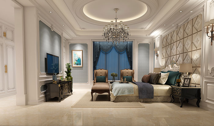 這是一個(gè)很大的客廳,因此設(shè)計(jì)師設(shè)計(jì)了一個(gè)造型別致的吊頂,鑲金邊的異型吊頂圖案,使平面的天花板呈現(xiàn)出立體感,恢弘大氣。