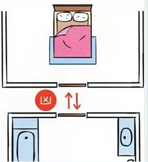 房間里的廁所對到床,情況比房門對到廁所嚴重:對到頭,會頭痛、思考時不能集中,住久了容易產生腫瘤、中風等;對到腰,會腰酸、心臟無力、水腫,住久了容易產生糖尿病、心臟病;對到腳,會坐骨酸痛、膝蓋無力、痛風水腫,住久了容易產生意外骨折。