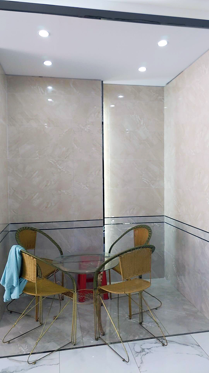 金屬條的運用,將整個空間縱向、橫向分割,將產品的深淺鋪貼分割的更加明顯。