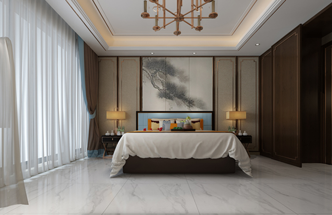 臥室家具采用實木紋,高貴大氣,設計成松子樣式的屏風完美的體現了不可居無松的文人理念,配合深蘊古風的燈具,更顯古典。白色系落地窗簾與地磚相得益彰,整個臥室透著一絲絲涼意。